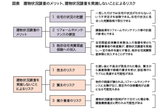 以下が、公益社団法人 全日本不動産協会のHPに掲載されている建物状況調査のメリット、実施しない事のリスクです。